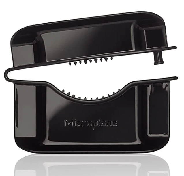 The Microplane Adjustable V Slicer with Julienne Blade hand-held mandoline features an ultra-sharp stainless steel blade, which can cut through various fruits and vegetables with ease. No need to store extra blades, as the Adjustable V slicer, has both blade types on one deck. Flip the deck for either julienne or straight edge blade prepping. The julienne blade can produce matchstick-like slices in all different thicknesses. You get to choose the setting you want, with the infinity dial. Microplane designed many features into this product to have the best experience using a hand-held mandoline.
