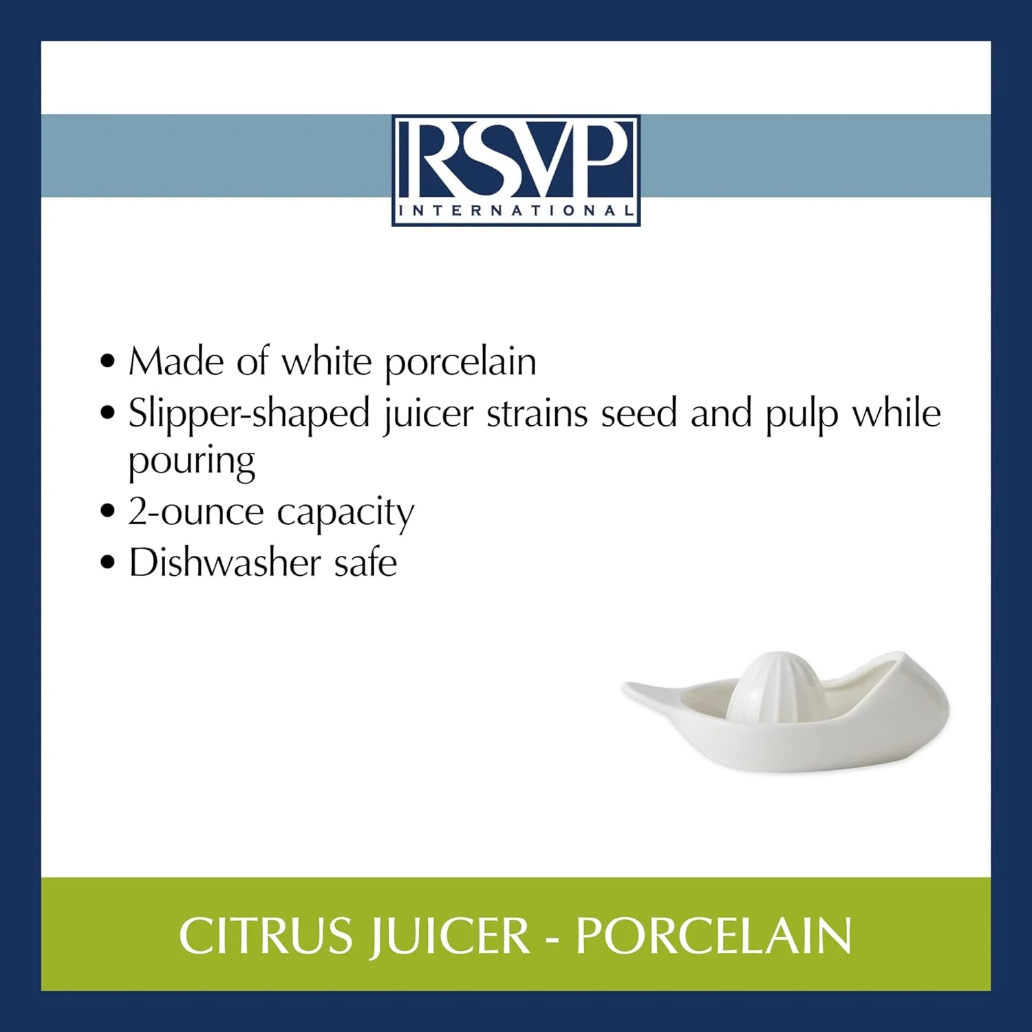 Slipper-shaped juicer is a novel way to extract the juice from lemons, limes and other small citrus fruits while straining seeds and pulp as you pour.